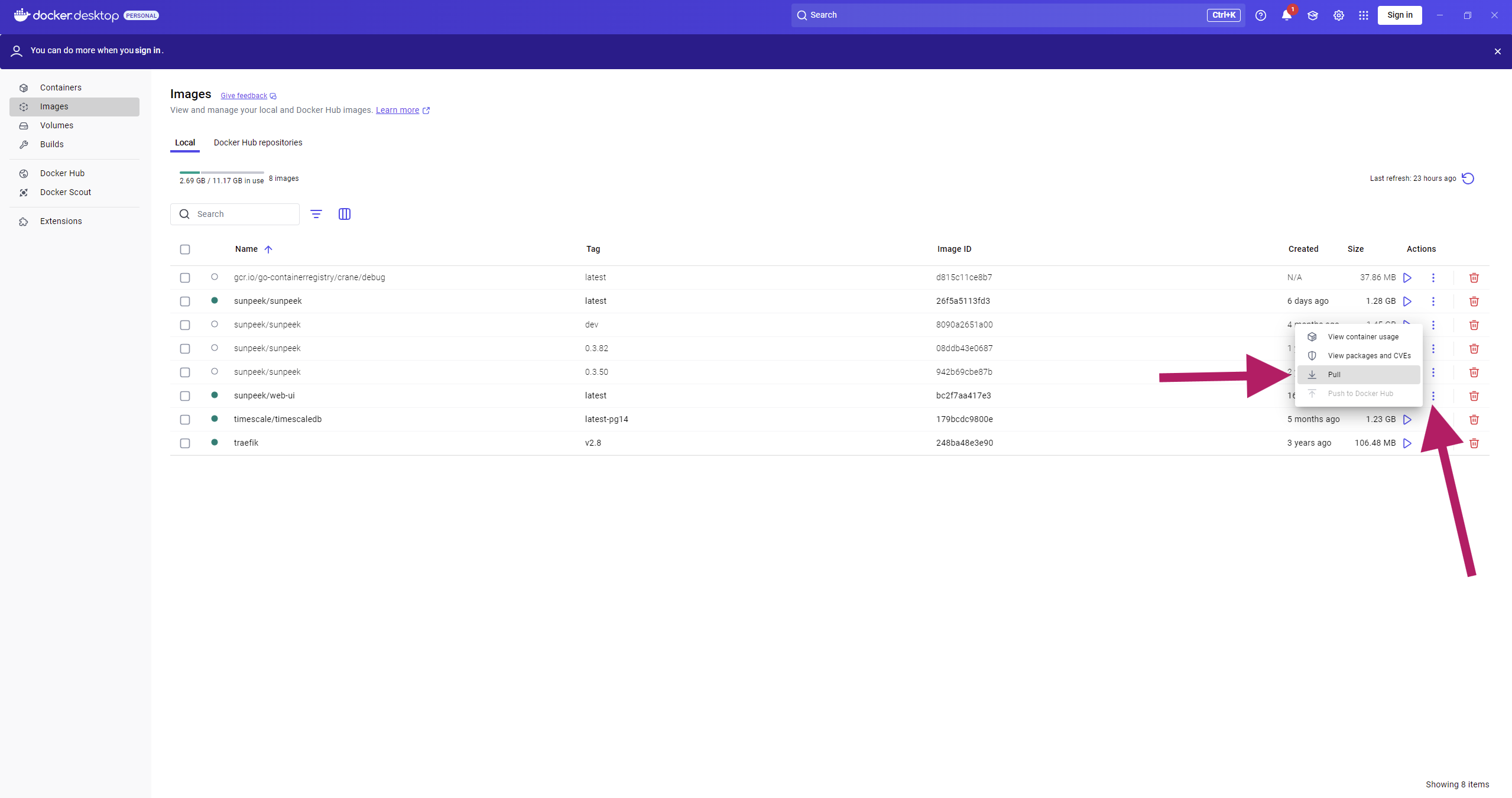 sunpeek/web-uiandsunpeek/sunpeek(with tag: latest).Please click on the menu-symbol (on the outer right) and select “Pull”.