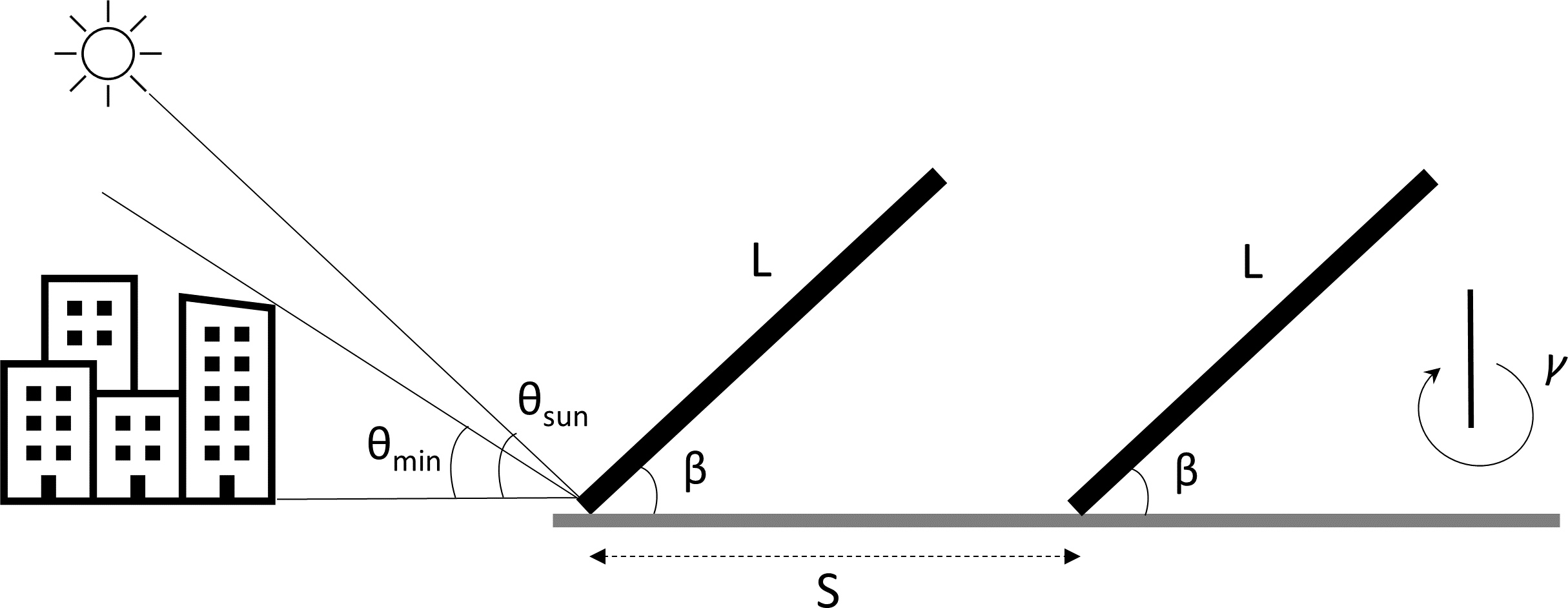 A practical approach to exclude external shading is to define a minimum sun elevation angle \(\theta_{\min}\). When the sun’s apparent elevation falls below this threshold, the array is considered shaded. This simple parameter can effectively exclude times when mountains, buildings, or other obstacles on the horizon cast shadows on the collector field (see figure below).