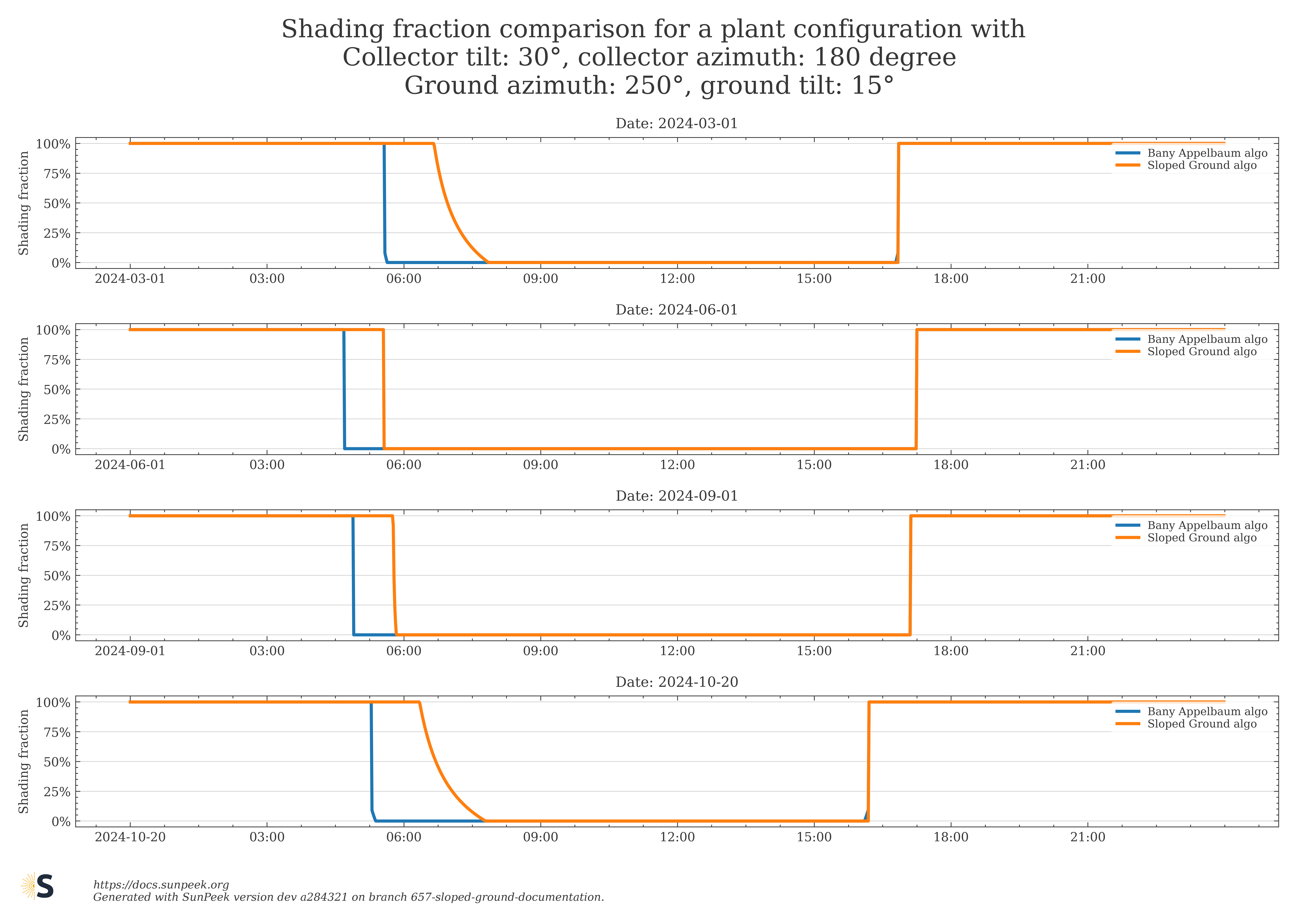 In this section, a few plots shall highlight the differences in output and compare the classical Bany Appelbaum with the new Sloped Ground algorithm. The new algorithm extends Bany Appelbaum by supporting different azimuth angles (of ground and collector field).