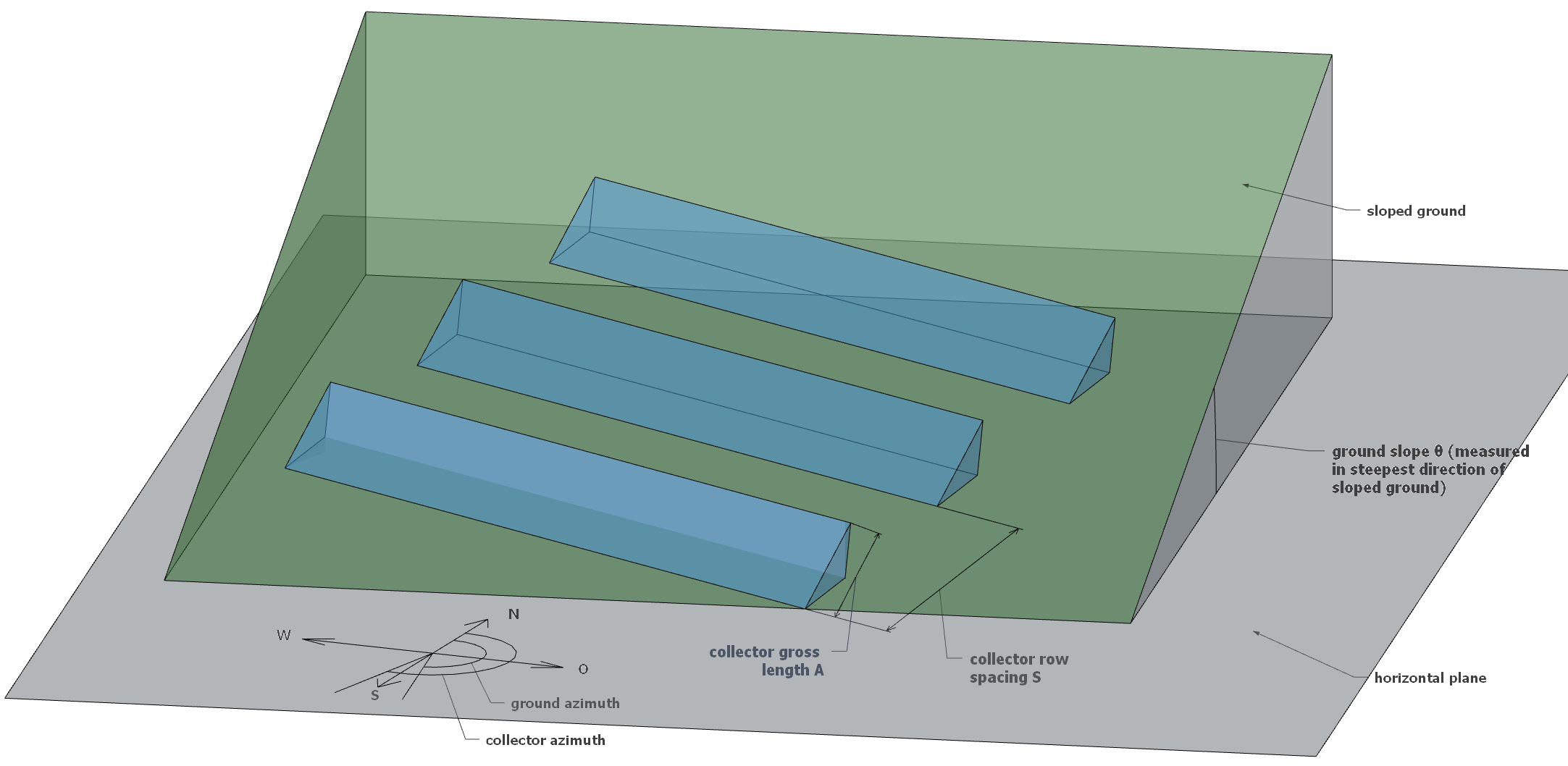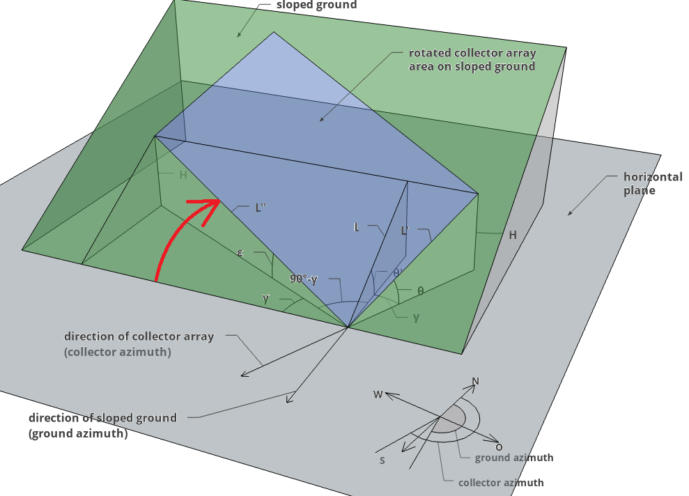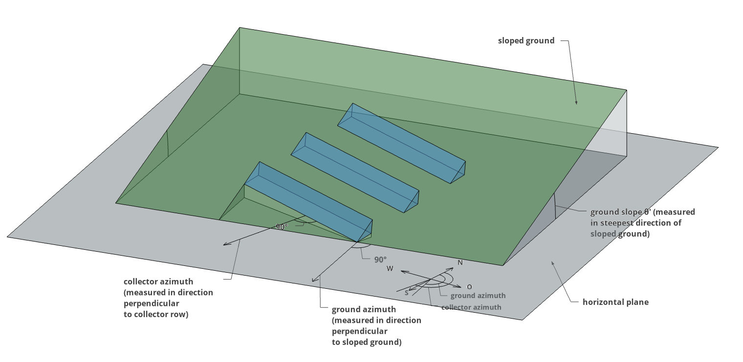 So far, only the sloped ground was considered and the direction angles that span the array on the sloped ground when obliquely mounted (see green area in Figure 5) are known. Up to this point, the collector tilt \(\beta'\) has not yet been considered; this is covered in the next step.