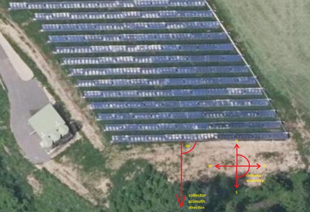 Collector azimuth \(\gamma_{c}\): angle between the north and the direction of the collector surface (measured in direction perpendicular to collector row), see Figures 1 and 2. Figure 2 shows how the collector azimuth can be measured from a satellite picture.