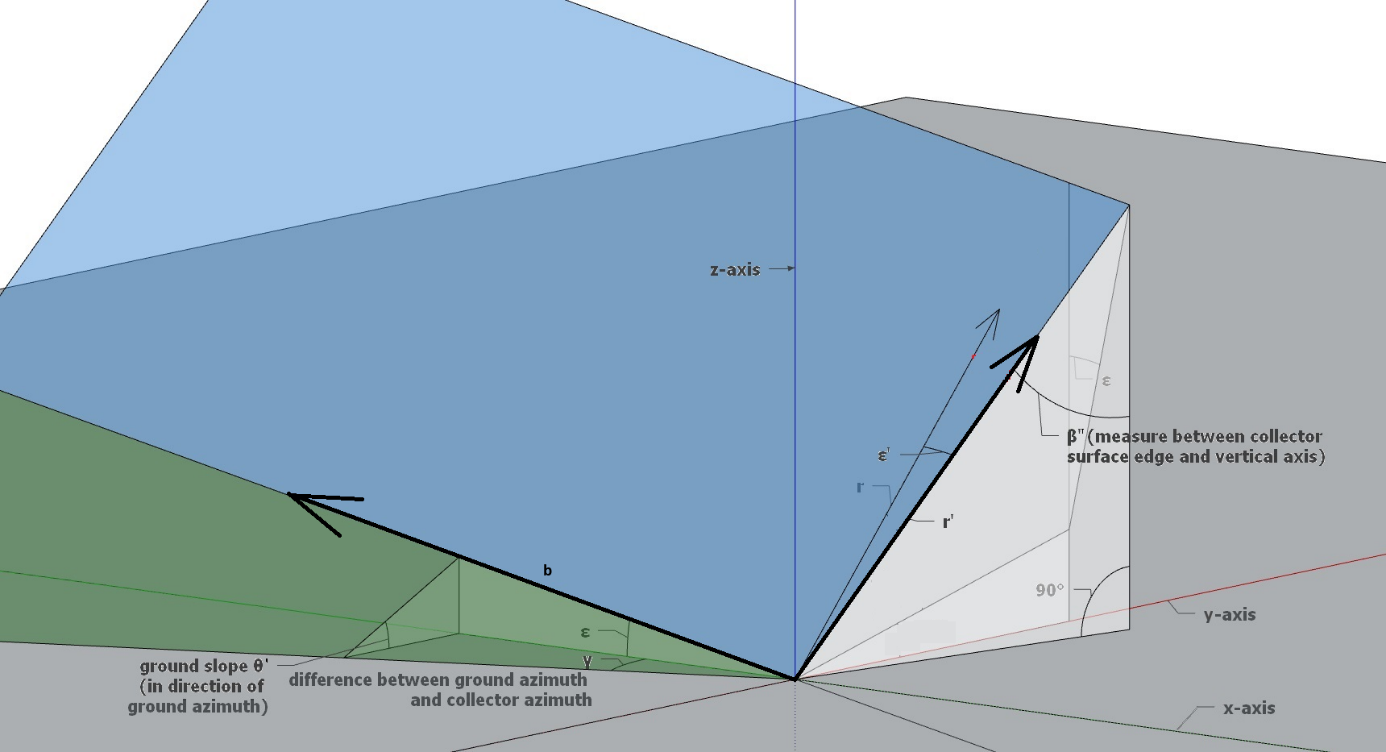 The vector along the collector row (perpendicular to collector azimuth) on the sloped ground: \(\overrightarrow{b} = \begin{pmatrix} - \cos \epsilon \\ 0 \\ sin \epsilon \end{pmatrix}\ \)