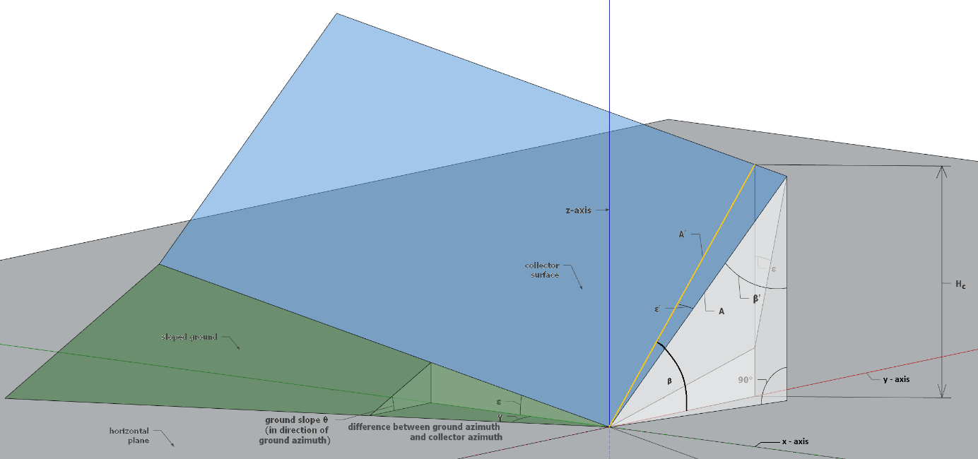 Angle between collector surface edge A mounted on sloped ground with different azimuths (\(\gamma_{c}, \gamma_{g}\)) and between direction of virtual collector surface edge A’; Note: without a ground tilt perpendicular to collector azimuth ε=0, A’ is the same as A and therefore it follows that ε’=0° |