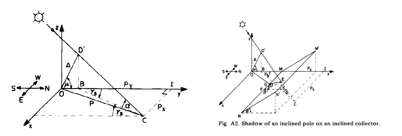 The pole 0’C defines the tangent of the shadow behind the inclined pole 00’. The intersection-point of this tangent and the plane equation for the collector surface defined above is the point where the shadow hits the collector surface.